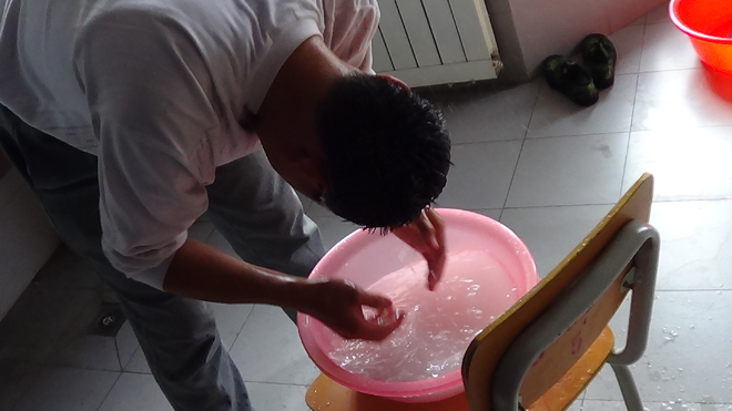 一等獎 作品名稱:一水多用 作品簡介:現(xiàn)在水資源嚴重短缺,我們應該學會節(jié)約用水,最實用簡單的方法就是一水多用,這組照片是一個男生在宿舍的用水情況,他用一盆水洗頭,洗拖布打掃宿舍,最后才將一盆水倒掉。我們應該向他學習,學會一水多用。 土木1302班 楊蕓蕓 |